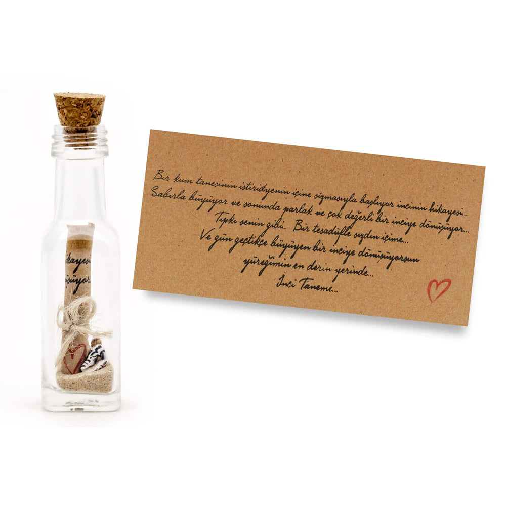 Tarihte günümüzdeki gibi teknolojinin (cep telefonu, bilgisayar) olmadığı dönemlerde aşıkların tercihi şişe içerisine yazılan notlar olmuştur. Belki de aşk mesajlarının en çok yakıştığı ve gizemini koruduğu yer bir şişenin içerisinde saklanan kelimelerdir. İlişkinizde yaşadığınız romantik anlarınıza bir yenisini daha ekleyecek şişe hediye notunuz, sizin için en özel kişiye daha özel hissettirmenizi sağlayacak. Üstelik kişiye özel notunuzu " şişeli hediye notu" ile süsleyerek hediyenizi daha da özel kılabilirsiniz. Şişe içerisinde en sevilen efsanevi "Bir Kum Tanesi" ile Başlayan Hediye Notu Şişenin doğal mantarı Hediye notunun sarıldığı doğal jüt ipi Karayip adalarının ince deniz kumu Seçilmiş deniz kabukları Tüm bu eşsiz sunumu kadife mücevher kutudaki konserve istiridye incinin yanına ilave ederek karşınızdaki kişiyi büyüleyebilirsiniz... |